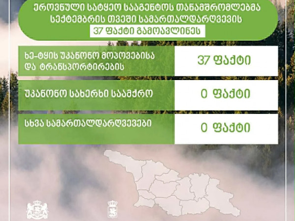 გამოვლენილი სამართალდარღვევებიდან 37 ფაქტი ხე-ტყის უკანონო მოპოვება და ტრანსპორტირებაა. ამოღებულია უკანონოდ მოპოვებული სხვადასხვა სახეობის 116 კუბურ მეტრამდე ხე-ტყე, რომელიც სააგენტოს „საქმიან ეზოებში“ დასაწყობდა.