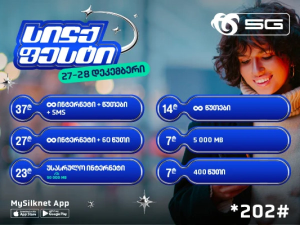 27 და 28 დეკემბერს, სილქფესტის აქციის ფარგლებში, აბონენტებს შესაძლებლობა ექნებათ ერთი და მეტი პაკეტი შეიძინონ Mysilknet აპლიკაციიდან, სილქნეტის ვებ გვერდიდან ან კოდით *202# . ამავე კოდით მსურველი გაუაქტიურებს ნებისმიერ პირობას სხვა ნომერსაც.