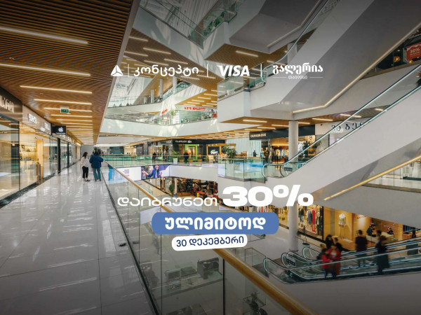 თიბისი კონცეპტის მომხმარებლებისთვის საახალწლო შეთავაზებები კვლავ არ დასრულებულა. მხოლოდ 30 დეკემბერს, გალერია თბილისის შერჩეულ ობიექტებში, თიბისი კონცეპტ Visa სადებეტო ბარათით გადახდისას, თანხის 30%-ს ულიმიტოდ და მომენტალურად დაიბრუნებთ.