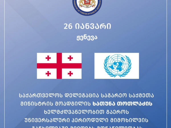 2026 წლის 26 იანვარს, ჟენევაში გაიმართება გაერთიანებული ერების ორგანიზაციის უნივერსალური პერიოდული მიმოხილვის (UPR) მე-4 ციკლის ფარგლებში საქართველოში ადამიანის უფლებების დაცვის მდგომარეობის შესახებ საქართველოს ეროვნული ანგარიშის (2021-2025 წლები) განხილვა.