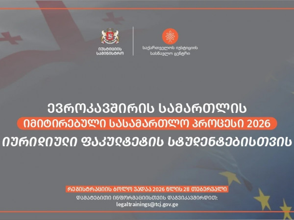 საქართველოს იუსტიციის სამინისტროსა და სსიპ „საქართველოს იუსტიციის სასწავლო ცენტრის“ ორგანიზებით იმართება ევროკავშირის სამართლის იმიტირებული სასამართლო პროცესი. პროექტი მიზნად ისახავს ევროკავშირის სამართლის შესახებ სტუდენტების ცოდნის გაღრმავებასა და საპროცესო უნარ-ჩვევების გაუმჯობესებას.