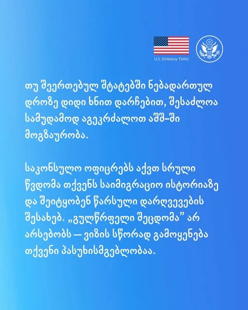 "თუ შეერთებულ შტატებში ნებადართულ დროზე დიდი ხნით დარჩებით, შესაძლოა სამუდამოდ აგეკრძალოთ აშშ-ში მოგზაურობა.