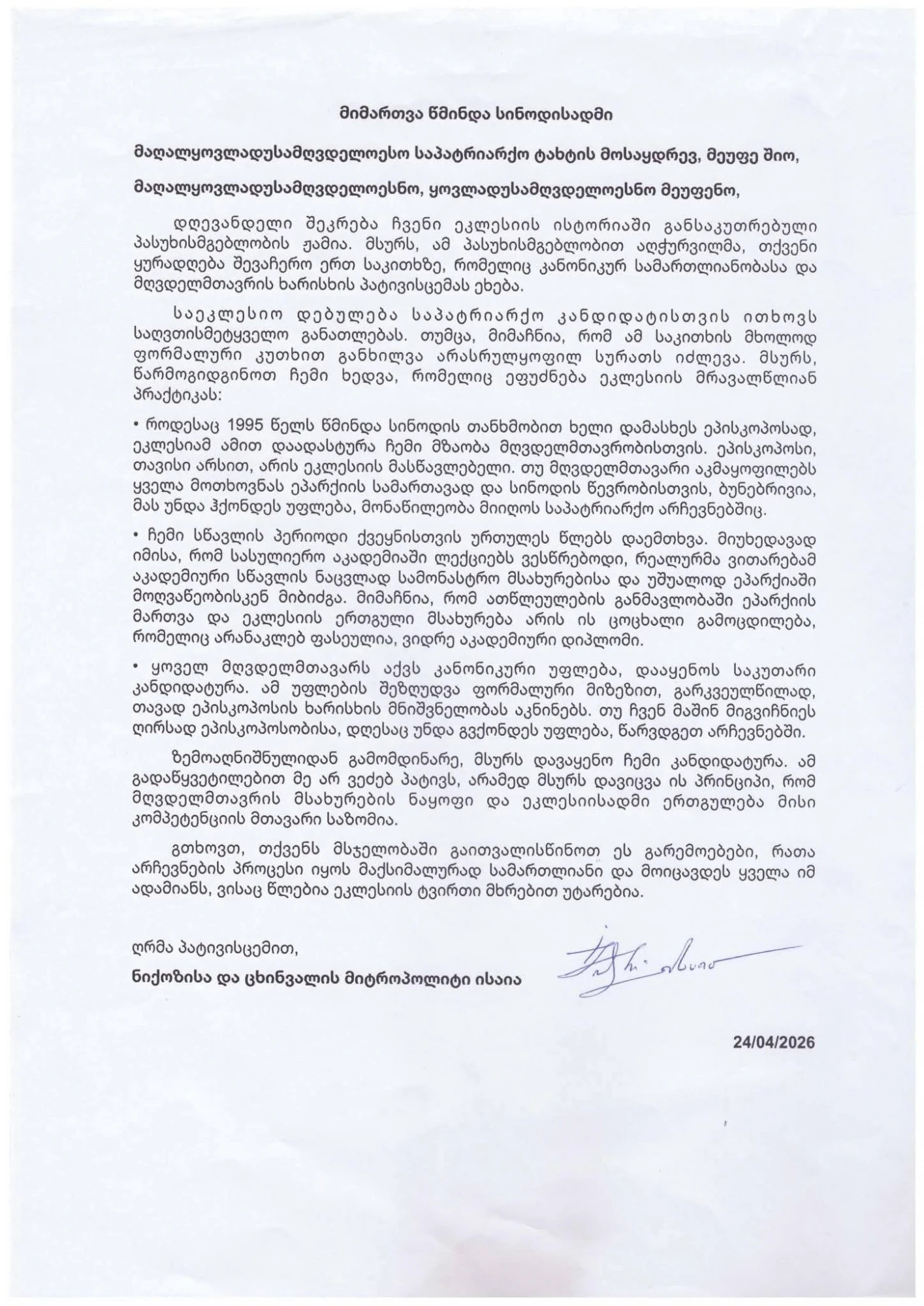 გთხოვთ, თქვენს მსჯელობაში გაითვალისწინოთ ეს გარემოებები, რათა არჩევნების პროცესი იყოს მაქსიმალურად სამართლიანი და მოიცავდეს ყველა იმ ადამიანს, ვისაც წლებია ეკლესიის ტვირთი მხრებით უტარებია" | წერს ნიქოზისა და ცხინვალის მიტროპოლიტი ისაია სინოდისთვის მიმართვაში.