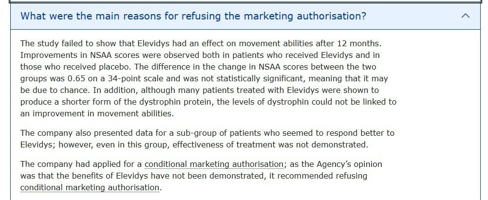 მიხეილ სარჯველაძემ მედიას წარუდგინა EMA-ს 2025 წლის 24 ივლისის გადაწყვეტილება, სადაც აღნიშნულია "12 თვის შემდეგ პაციენტებში მოძრაობის უნარის გაუმჯობესების ეფექტი არ დადასტურდა პლაცებოსთან შედარებით. ევროპის წამლის სააგენტომ დიუშენის წამლის რეგისტრაციაზე უარი განაცხადა.