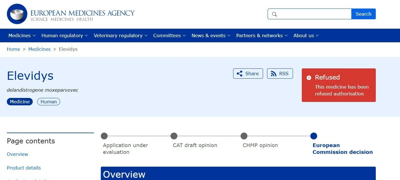 მიხეილ სარჯველაძემ მედიას წარუდგინა EMA-ს 2025 წლის 24 ივლისის გადაწყვეტილება, სადაც აღნიშნულია "12 თვის შემდეგ პაციენტებში მოძრაობის უნარის გაუმჯობესების ეფექტი არ დადასტურდა პლაცებოსთან შედარებით. ევროპის წამლის სააგენტომ დიუშენის წამლის რეგისტრაციაზე უარი განაცხადა.